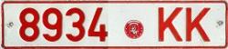 Alte Kennzeichen bis April 2004 mit roter Schrift auf weißem Grund. Die ersten beiden Buchstaben geben den Zulassungsort an. Auf Lkw und Anhängern wird das Kennzeichen am Fahrzeugheck aufgemalt wiederholt. |