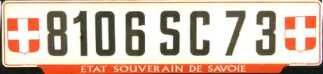 Kennzeichen der Savoier "Separatisten". Zu finden in den Départements 73 und 74 mit einem Wappen ihrer Region, dem Savoier-Kreuz, der Schweiz nachempfunden. Zu Anfang machte die Gendarmerie Jagd auf diese Fahrzeuge, aber mittlerweile werden sie geduldet. |