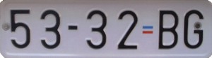 Heute aktuelles Kennzeichen aus Serbien in europäischer Aufmachung mit dem Landeswappen als Trennzeichen. Die ersten beiden Buchstaben geben den Zulassungsort an. |